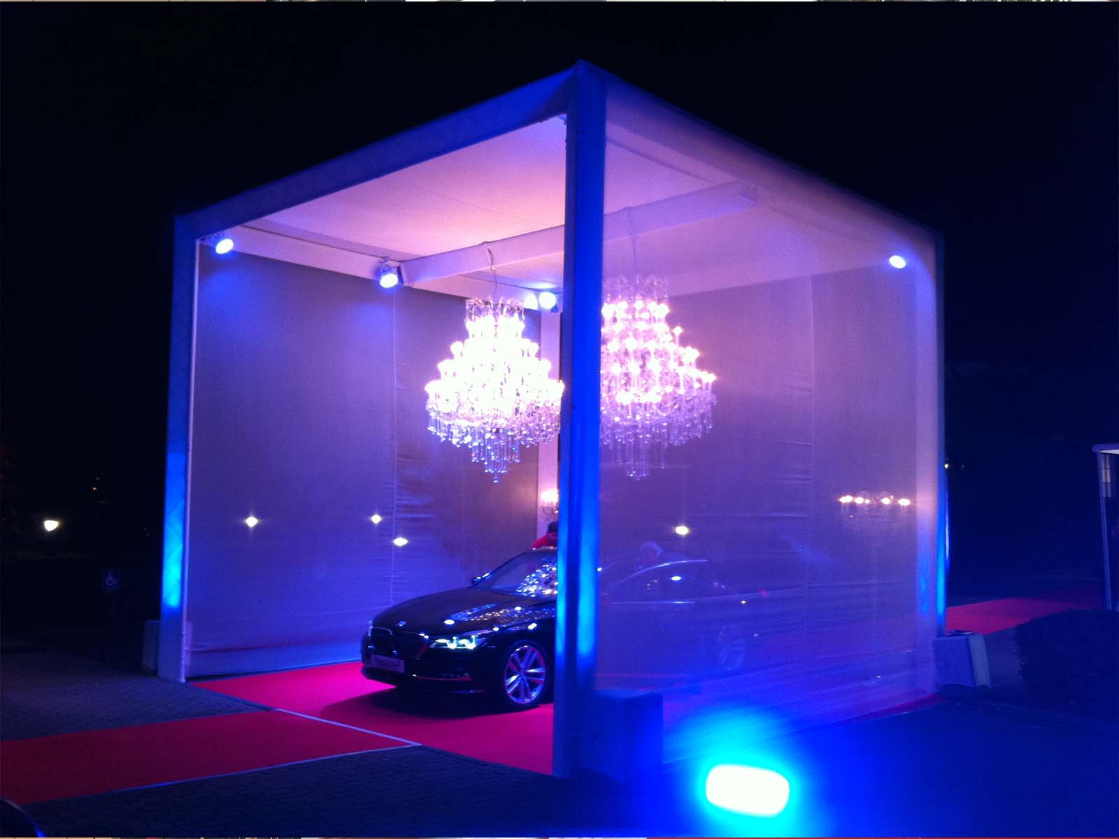 Lancement et présentation de la Série 7 de BMW à l’IRCAD. Installation d’un grill de 6x6m et mise en avant du véhicule, chemin de moquette rouge et installation de lustre en verre XXL