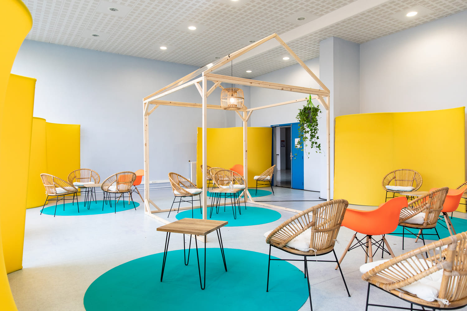 Aménagement d’espace pour le salon Méthagora de GRDF à Saint Quentin pour notre client Dialogues&Solutions, répartition sur 3 étages avec création maisonnettes en bois, signalétique, habillage moquette et décoration végétale.