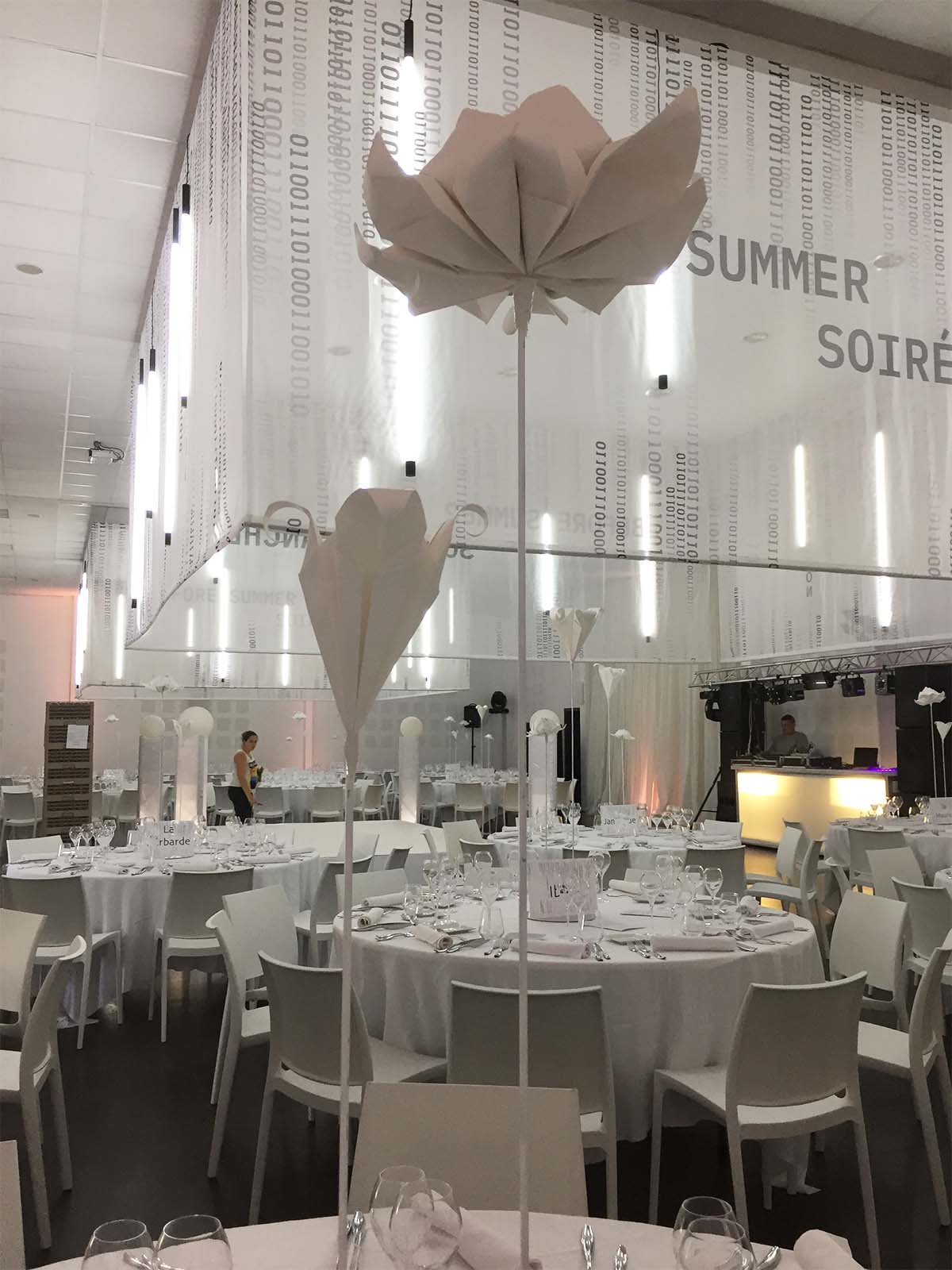 Réalisation de l’ensemble de la décoration pour la soirée blanche de l’entreprise ADIS. Impression sur voile, jeux de néons, centres de table réalisés en origami de papier. Le tout orchestré par notre cliente ADDICTE, à l’espace Kaléido.