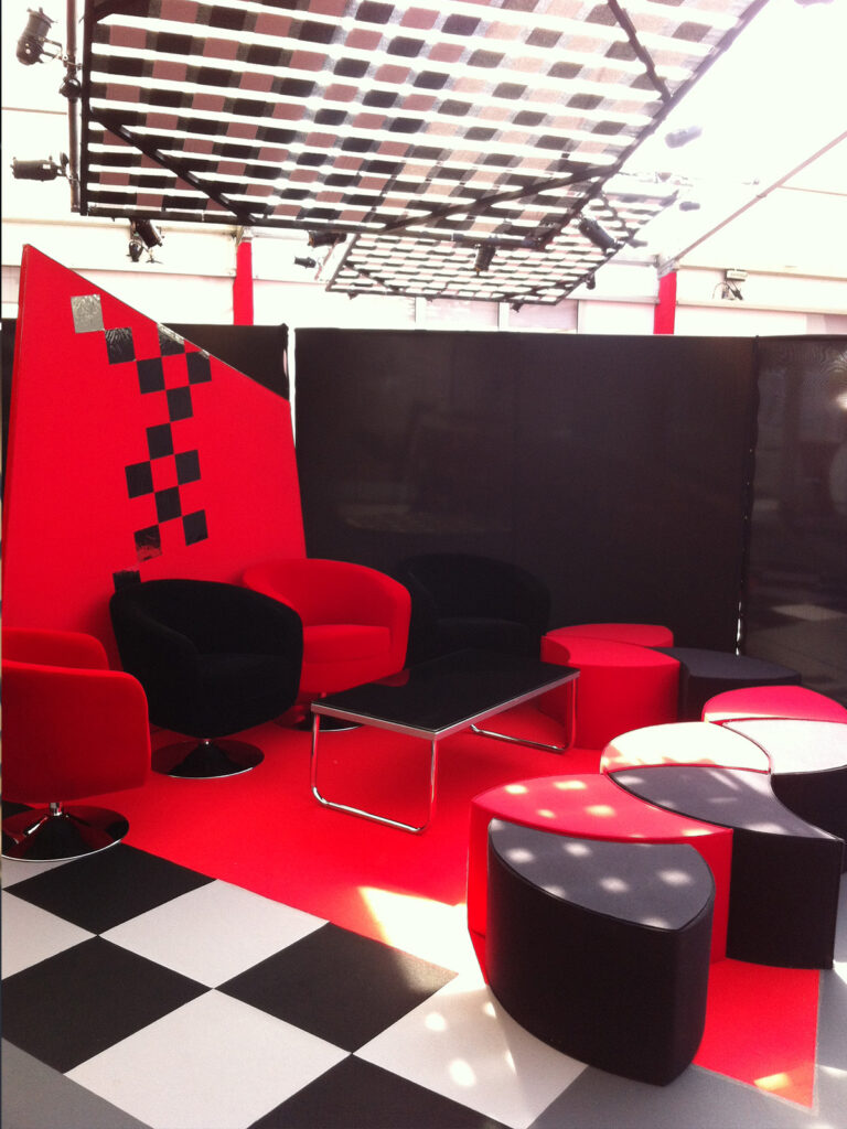 création de l’espace VIP de la FFSA – le Paddock appelé Platinum Bar Inclusion de formes de moquette dans la moquette du chapiteau